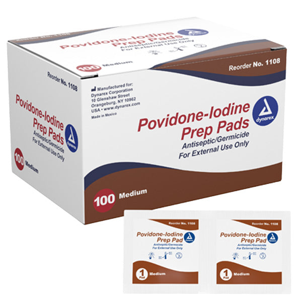 Dynarex 1108 Povidone Iodine Prep Pads are a non irritating germicidal antiseptic prep wipe used to swab the skin and kill bacteria prior to medical procedures. Povidone Iodine Prep Pads are a first aid antiseptic used to help prevent skin infection in minor cuts, scrapes, and burns. Iodine prep pads are made up of 10% Povidone Iodine, non-oxynol-9, and water.