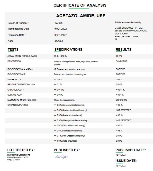 Acetazolamide USP is generally manufactured through a chemical synthesis process. The initial step involves the reaction of cyanogen with thiosemicarbazide, which leads to the formation of acetazolamide. The product is then purified and crystallized to obtain the final API.