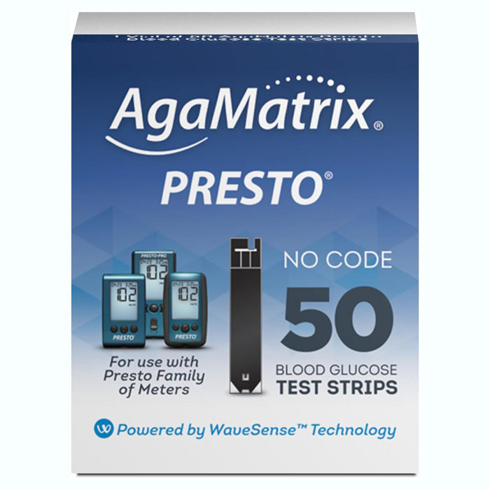Each box of AgaMatrix Presto Blood Glucose Test Strips contains 50 test strips.