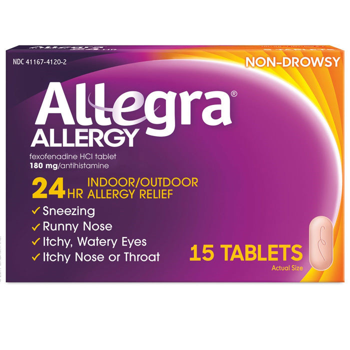 Experience powerful, all-day relief from allergy symptoms with Allegra® 24 Hour Allergy Relief! Each easy-to-swallow tablet delivers 180 mg of fexofenadine HCl, a proven non-drowsy antihistamine, to combat seasonal and perennial allergies. Designed for busy lifestyles, Allegra works fast—without causing sleepiness—so you can tackle work, school, outdoor activities, and everything else life throws your way. Trusted by millions and recommended by doctors, Allegra is your go-to solution for clear, comfortable, and focused days. Includes: 15 tablets per box.