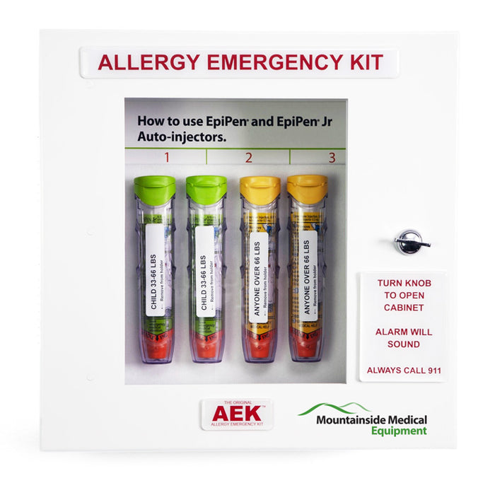 Note: This kit cabinet comes empty and does not contain epinephrine. It is shown with epinephrine for display purposes only