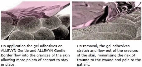 Allevyn Sacrum Gentle Border is a hydrocellular adhesive dressing. Made with a soft silicone gel adhesive that gently attached to fragile, sensitive skin securely. Designed to fit on the sacral area without causing pain or trauma on the skin during removal. Ideal for patients with fragile skin. Allevyn Sacrum Gentle Border dressing's new design aids in application placement for optimal fit on the sacral area. Allevyn Gentle is designed to absorb exudate from pressure ulcers that form from pressure caused by the tail bone. The sacral area is difficult to treat because it is located in an area where a person sits a majority of the day, and Allevyn Gentle Border Sacrum is the perfect solution to treat this awkward, painful skin condition.