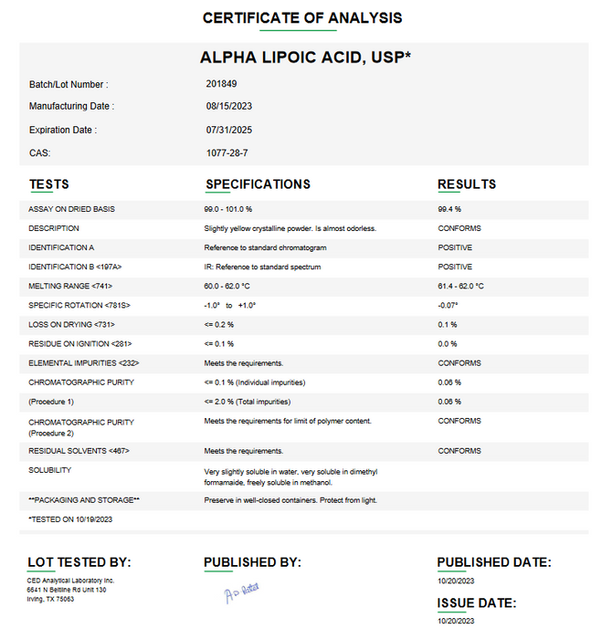 Alpha-lipoic acid has been approved by the United States Pharmacopeia (USP) as an API, which means it is a substance that can be used in the manufacture of medicinal products and has been evaluated for its purity and potency.