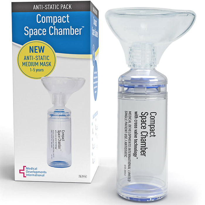 The Antistatic Compact Space Chamber Plus is a type of spacer called a valved holding chamber. It breaks the medication into smaller, easier-to-inhale droplets and suspends the medication in the chamber. This allows patients to inhale the full dose and for maximum effectiveness. The user can inhale all of the medication in one deep breath or with several smaller breaths. Because any exhalation will be directed back into the spacer rather than open air, the medication is not lost.