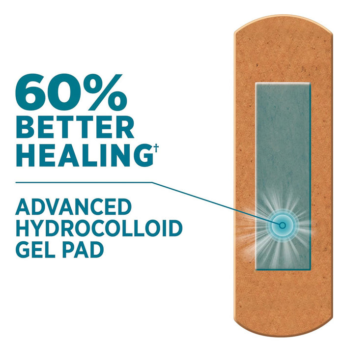 Band-Aid Pro Heal Adhesive Bandages with Hydrocolloid Gel Pads are a type of bandage that has a special gel pad in the middle. This gel pad is made of a hydrocolloid material, which forms a protective barrier over the wound and absorbs any excess fluid. This creates a moist environment that is ideal for wound healing. The bandages also have adhesive edges to keep them securely in place. They are designed to promote faster healing, reduce scarring, and protect the wound from infection.