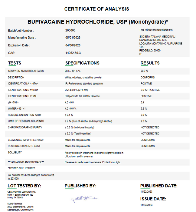 - USP-Grade, High-Purity Bupivacaine: Meets United States Pharmacopeia standards for consistent potency, purity, and safety—optimal for precision compounding.