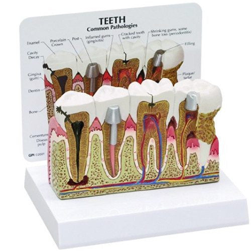 Model clearly indicates plaque, tarter, bone loss, decay, crown, cavity, abscess, periodontitis, root canal, gingivitis, and shrinking gums.