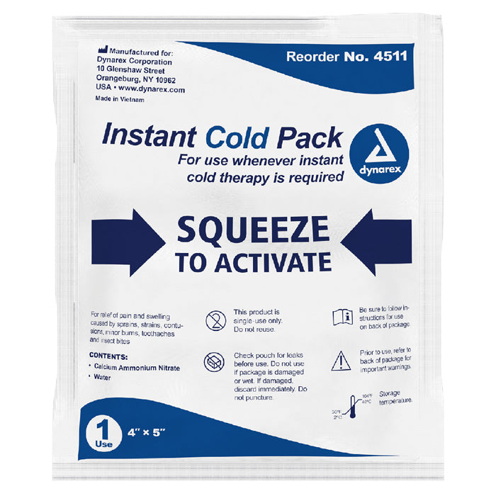 Looking for an inexpensive instant cold pack for your sports team? The Dynarex Instant Cold Pack is a disposable cold compress used for cold therapy to minimize pain and reduce swelling. Refridgeration is not needed. Single-use. Great for sports injuries. 4 x 5 Junior size is easy to store in first aid kits, medical trauma bags and small spaces.