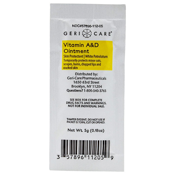 Geri-Care Vitamin A and D Ointment Packets are a form of topical medication used to treat and prevent skin irritation, inflammation, and dryness. The packets contain a combination of Vitamin A and D, which are essential nutrients for maintaining healthy skin. The ointment is usually applied to affected areas of the skin to help soothe and protect the skin from external irritants.