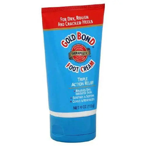 SkinFooGold Bond Foot Cream 4 oz is a therapeutic moisturizing cream for dry, cracked heels, ankles and feet. It is made with several essential vitamins that promote quicker healing and increase moisture levels. Gold Bond Foot Cream is non-greasy formula that conditions and repairs extremely dry, rough skin.