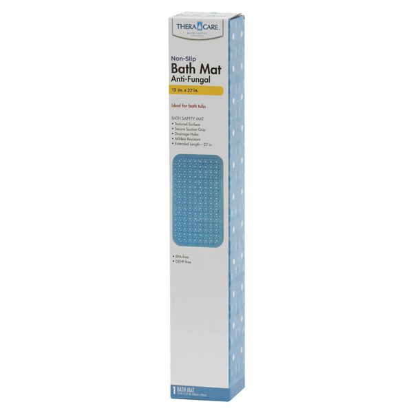 Thernacare Bathtub Shower Mat is a non-skid mat designed for use in bathtubs and showers. It measures 15 x 27 inches and has a textured surface to prevent slipping. The mat also features a secure suction grip that helps keep it in place. It has drainage holes throughout the surface to prevent water from pooling and creating a slipping hazard.