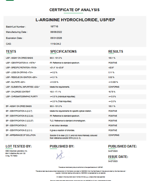 L-Arginine USP, is a high-quality, purified form of the amino acid L-Arginine. It is used as an active pharmaceutical ingredient in compounding medications and is commonly used in medical treatments that target the cardiovascular system.