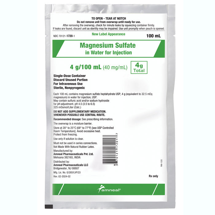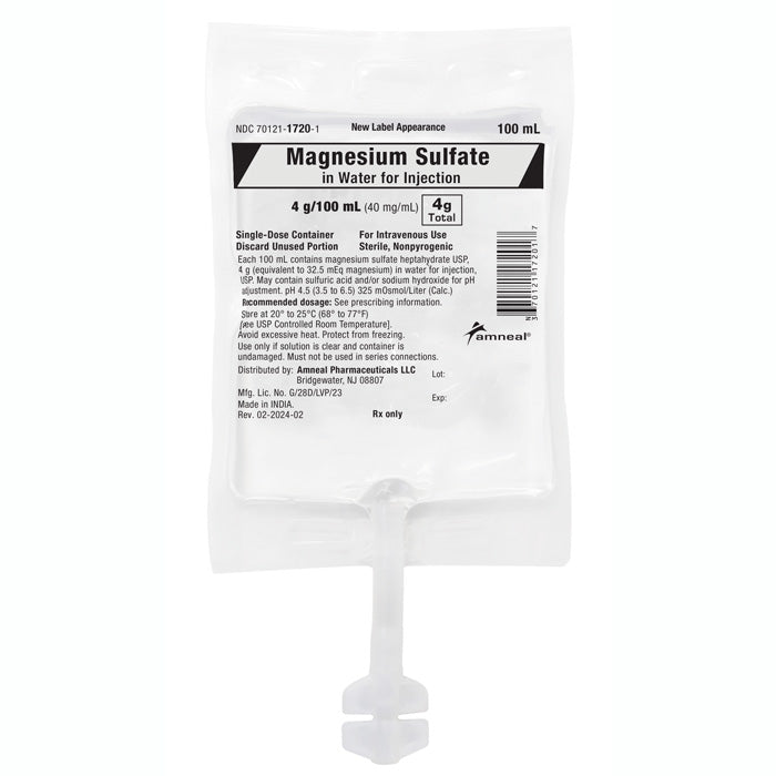 Magnesium Sulfate 4% in Water IV Bags by Amneal Pharmaceuticals deliver precision and ease in managing magnesium deficiencies and related conditions. Ensure safe usage by adhering strictly to healthcare provider instructions and monitoring protocols.