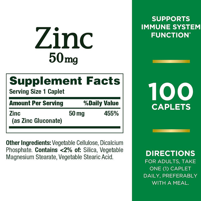 Zinc caplets 50 mg are a supplemental form of the essential mineral zinc. Zinc is important for many bodily functions, such as immune system function, wound healing, and DNA synthesis. Zinc caplets 50 mg may be used to help treat zinc deficiency and to support overall health and wellbeing. Zinc may also be used to help with the common cold, diarrhea, skin conditions, and age-related macular degeneration. Some research suggests that zinc may help to treat depression, reduce symptoms of ADHD, improve fertility in men, and support bone health. Always consult with a healthcare professional before starting any new supplement regimen.