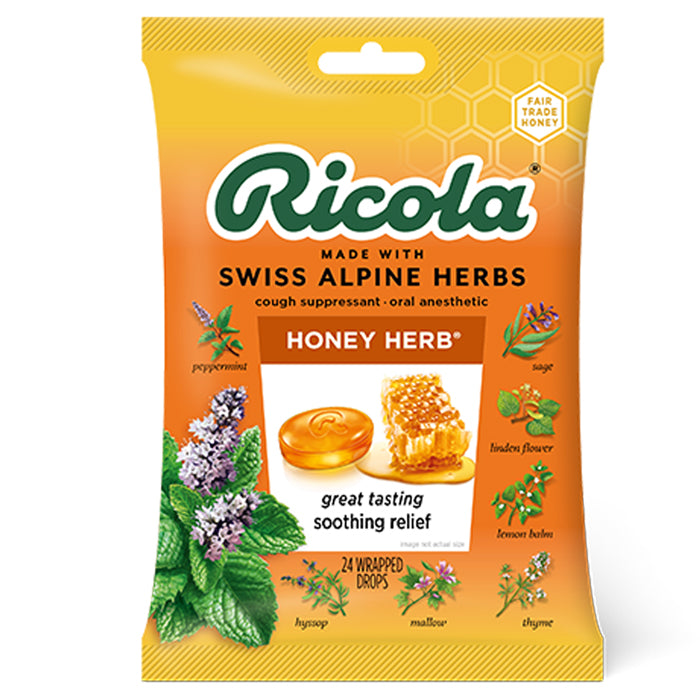 • Ricola Honey Herb drops blend great tasting Swiss herbal ingredients with honey. Ricola Honey Herb throat drops bring you soothing relief from dry, scratchy, hoarse, or sore throats due to colds, coughs, or allergies. Active Ingredient (in each drop): Menthol, 2.0 m