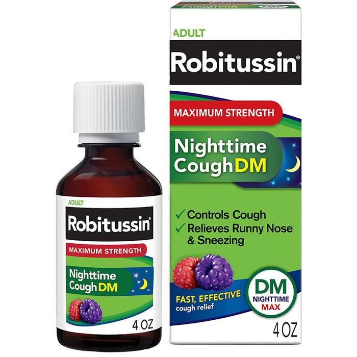 Robitussin Maximum Strength Nighttime Cough DM is a cough medicine for adults that delivers the reliable, soothing impact of its original formula in a great-tasting, berry flavor. Formulated to tackle your cough symptoms, this liquid cough suppressant goes down quickly and helps you get on your way to a good night's sleep. Take 20 mL of Robitussin DM Maximum Strength Cough Relief Nighttime Medicine by mouth every six hours while symptoms persist. In addition to providing temporary relief for cough caused by colds, this nighttime cold medicine also works as an antihistamine and helps control and relieve runny noses and sneezing as well. Suited for adults and children 12 years and over, Robitussin is perfect for keeping near your bedside for when nighttime cold symptoms strike. This cough syrup is specially formulated to control the impulse to cough as you sleep, allowing you to get a good's night rest and put you on the path to recovery. Delivering cough relief for more than 70 years, Robitussin has the product you need to treat your specific cough, cold, sore throat or flu symptoms for day and night relief. Robitussin shuts coughs down.