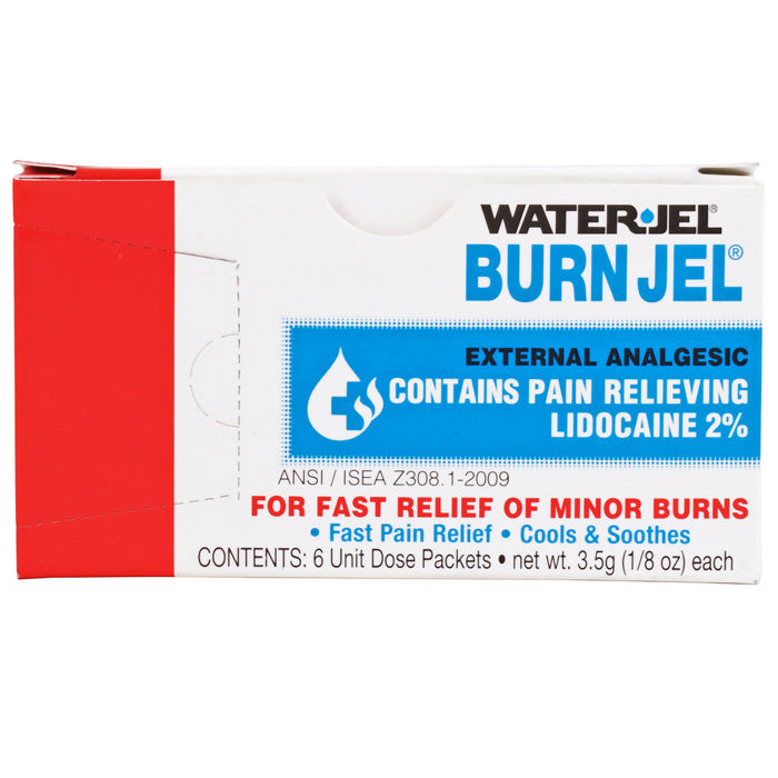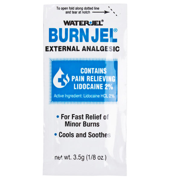 Water Jel Burn Jel burn relief with lidocaine 2% unit dose packets are small individual packets of a specialized topical gel that is designed to provide immediate relief for minor burns, including sunburns. The active ingredient in the gel, lidocaine 2%, is a local anesthetic that helps to temporarily numb the area and reduce pain. The gel also contains other soothing ingredients, such as aloe vera and tea tree oil, to help cool and moisturize the skin. The single-use packets make it convenient to carry and use for on-the-go relief. This product is commonly used in first aid kits, hospitals, and other medical settings for treating burns.